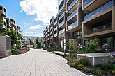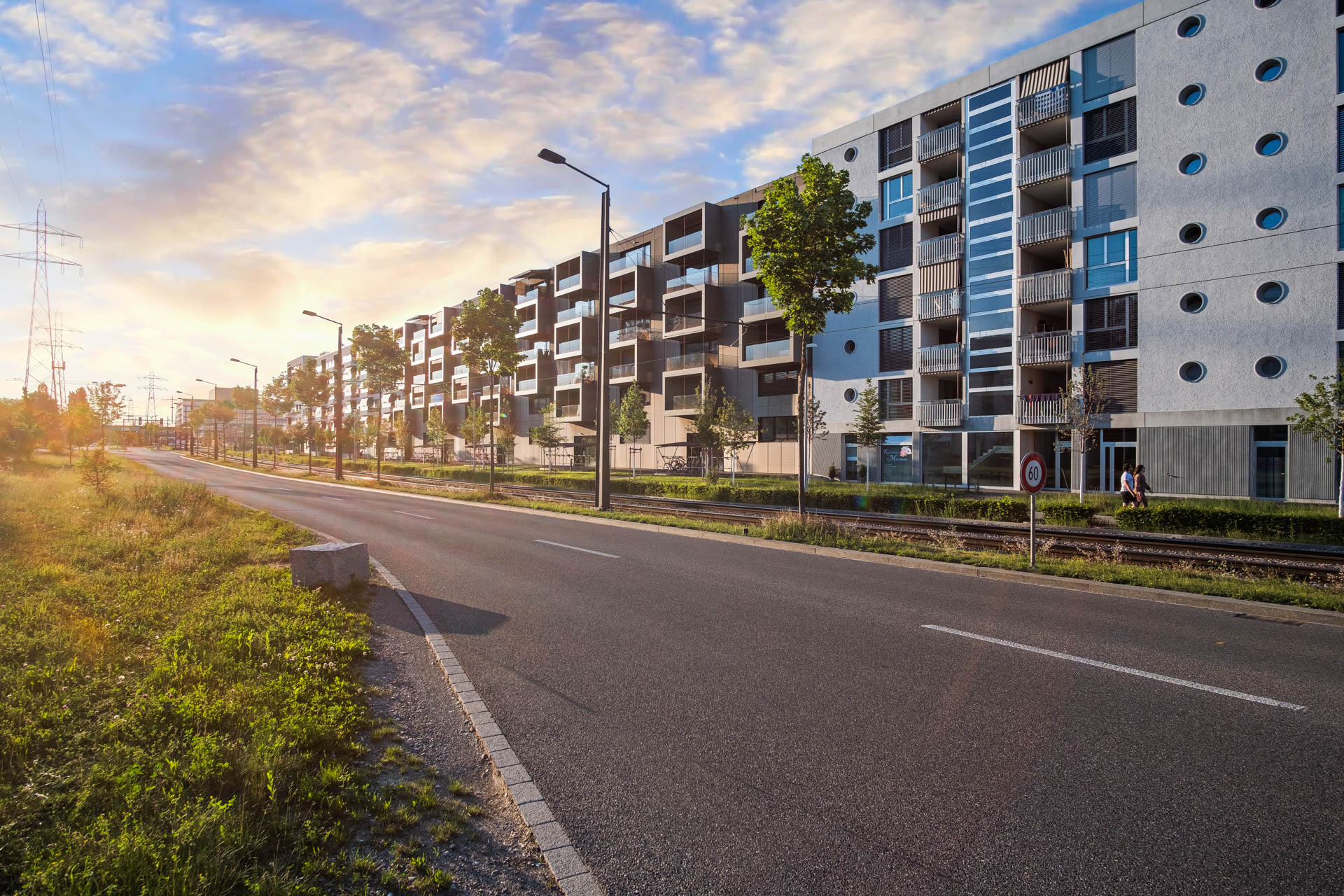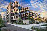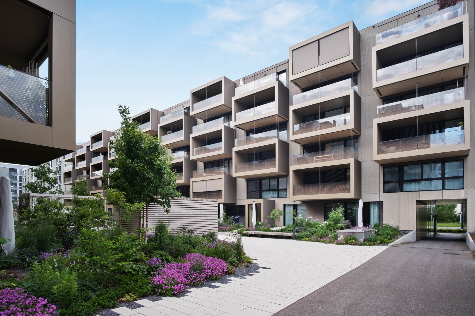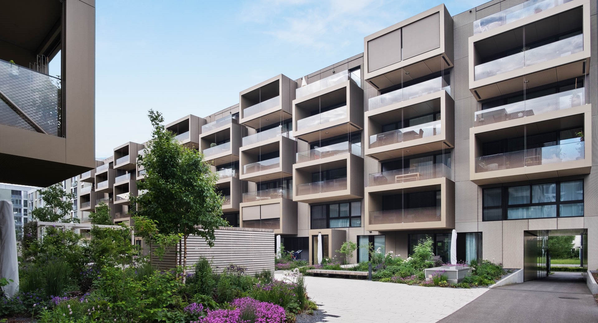 Auffällig sind die herausragenden Loggia- und Balkonelemente, die viel Licht in die Wohnungen lassen. Die warmen Farbtöne der Fassaden vermitteln einen einladend wohnlichen Eindruck. Matt versiegelte Bodenbeläge aus Eichenparkett im Wohnbereich und farblich abgestimmte keramische Platten auf Loggien und Balkonen schaffen eine behagliche Ambiance.