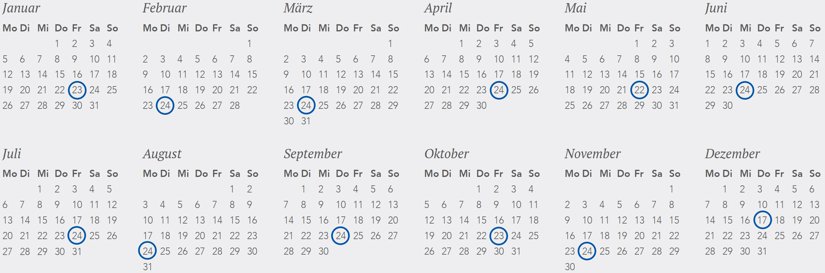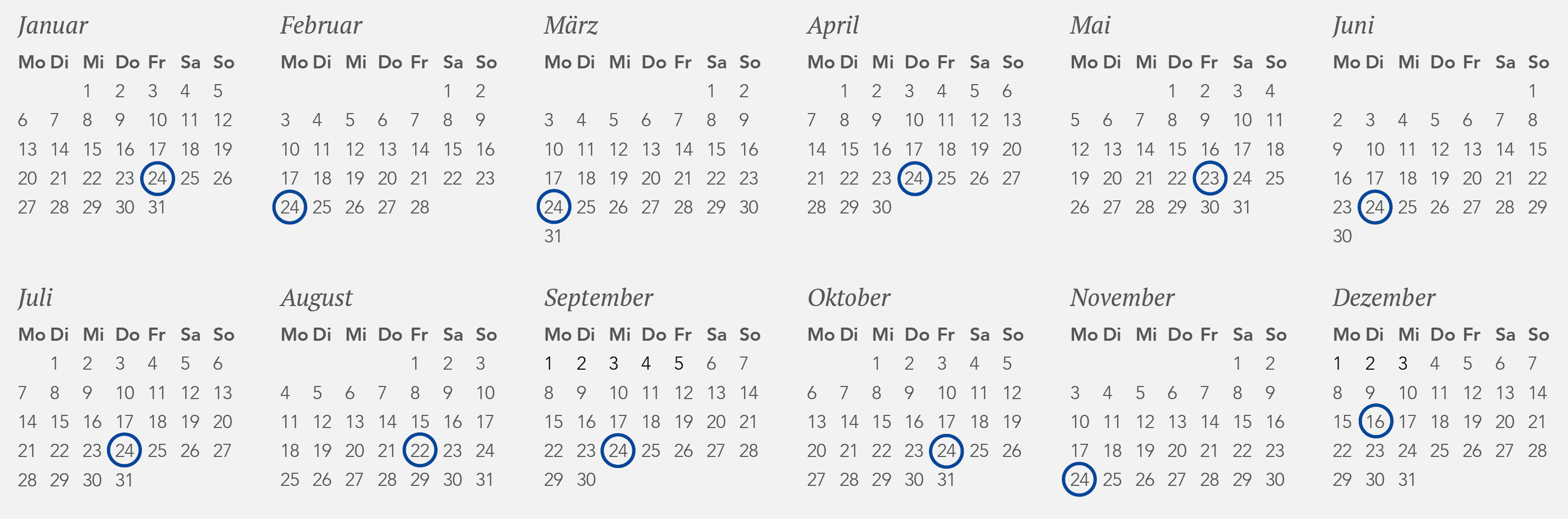 Die Rente wird von uns pünktlich ausbezahlt. Auf dem Kalender 2025 (oben) und 2026 (unten) sehen Sie blau markiert die Daten, an denen bei der BVK der Bankauftrag für die Rentenauszahlung gemacht wird. Im Normalfall ist das Geld gleichentags auf Ihrem Konto ersichtlich.